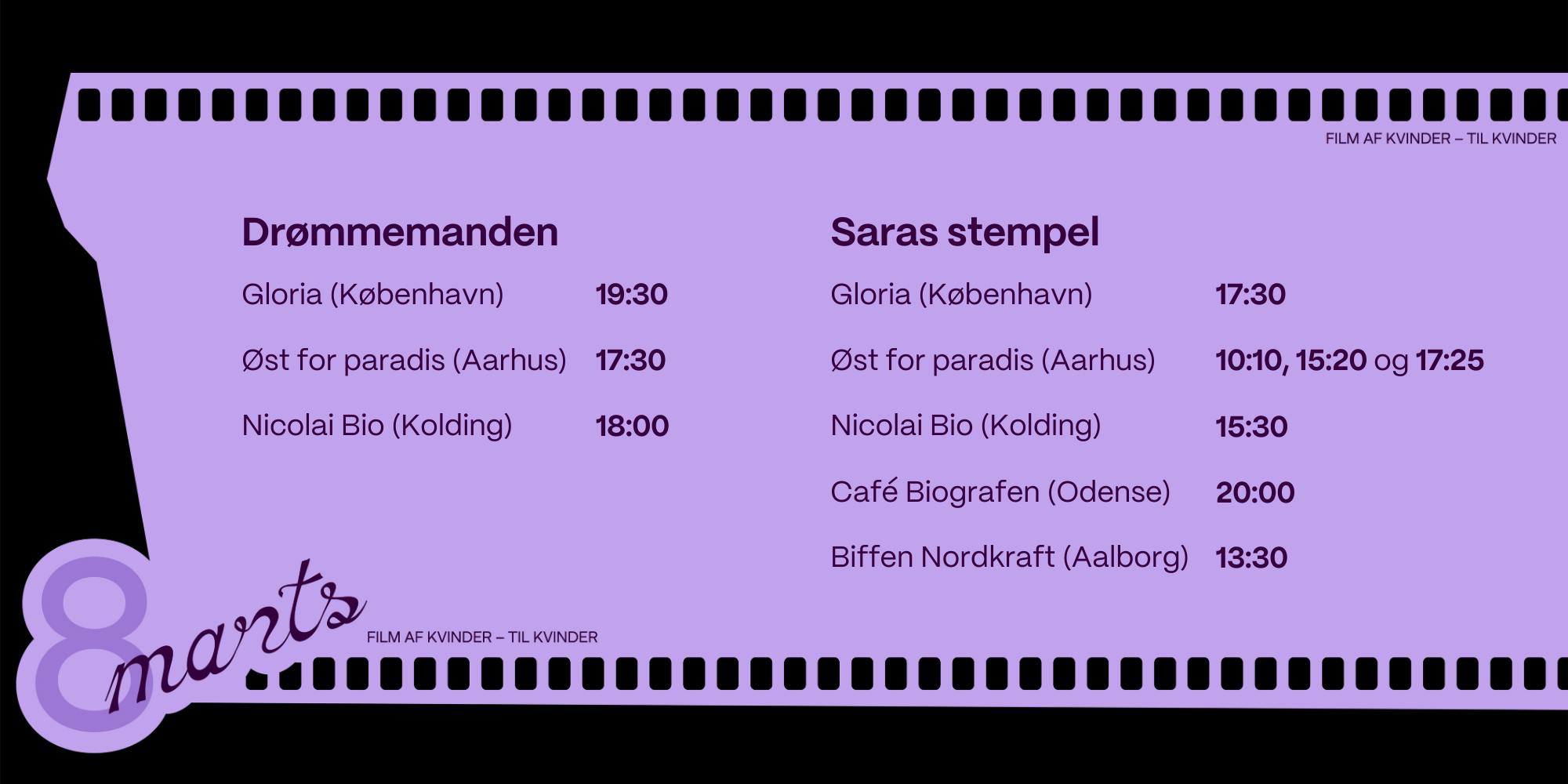På Kvindernes Internationale Kampdag den 8. marts inviterer Dansk Kvindesamfund til filmvisninger i biografer over hele landet. Sammen samler vi publikum i biografmørket for at se film, der tager kvinders liv, erfaringer og perspektiver alvorligt.
